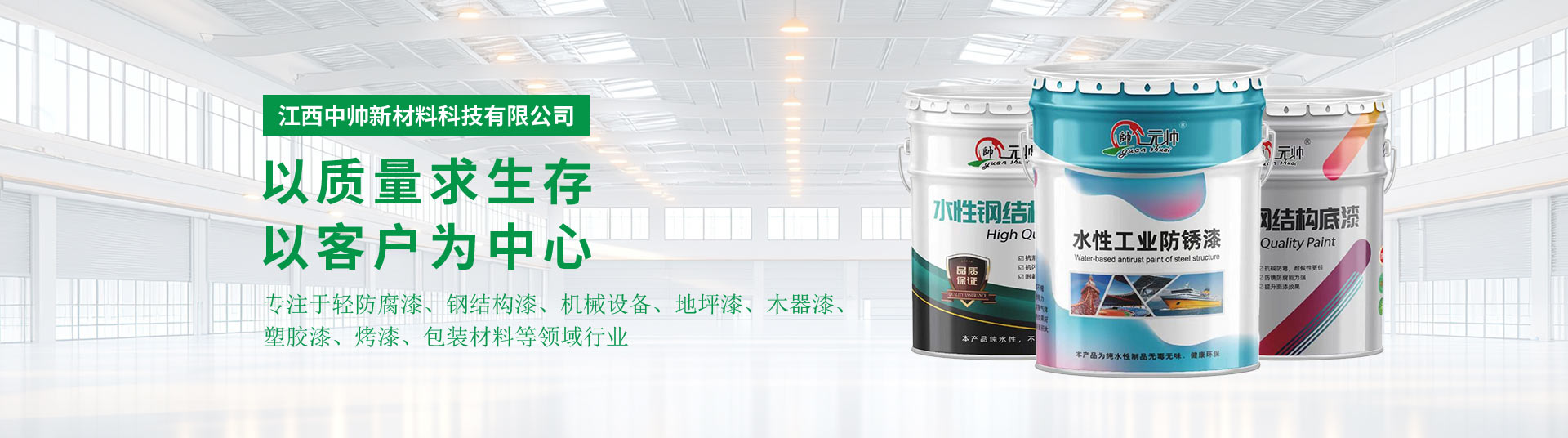 江西中帥新材料科技有限公司坐落于享有中國煙花之都美譽的萬載縣新能源產業園,是國內一家專業集研發、生產、銷售于一體的水性工業漆生產企業,在水性工業漆領域我們擁有近20年的行業經驗,公司擁有強大的專業研發團隊及先進的科研實驗室,生產設備均采用國內的全自動智能化生產線,年產水性工業漆產品5萬噸以上,實現了以江?省為中心輻射長江三角、珠三角全國范圍一站式服務平臺體系。